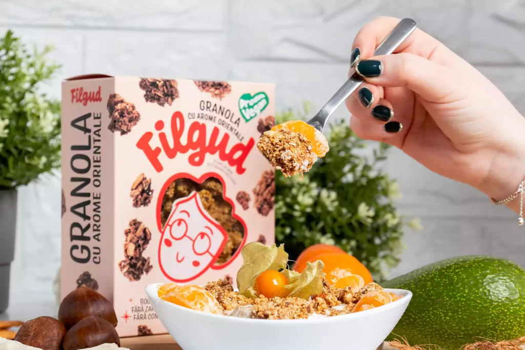 Granola noastră se poate ronțăi ca atare sau se poate savura în combinație cu „lapte” vegetal sau cu „iaurt” Filgud 🙂